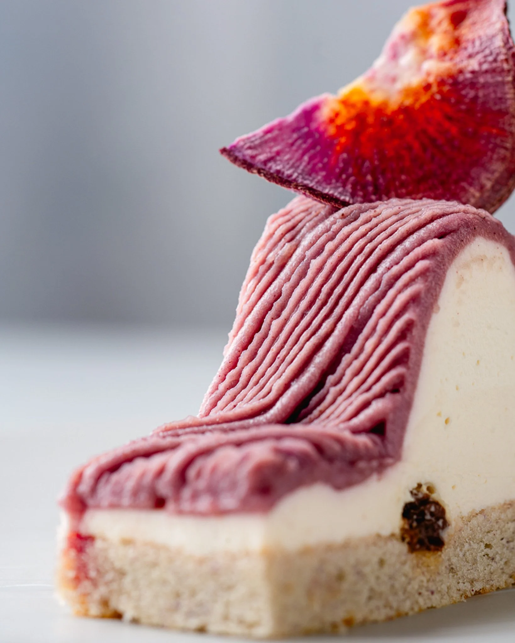 白いムースの下はラム酒に一晩つけたレーズンを、その上にはさっぱりしたサワークリームと、優しい甘さのきび砂糖でまろやかさとコクを出したラム酒のクリーム。トップはしっかりと紫芋を感じる濃厚なクリームに。