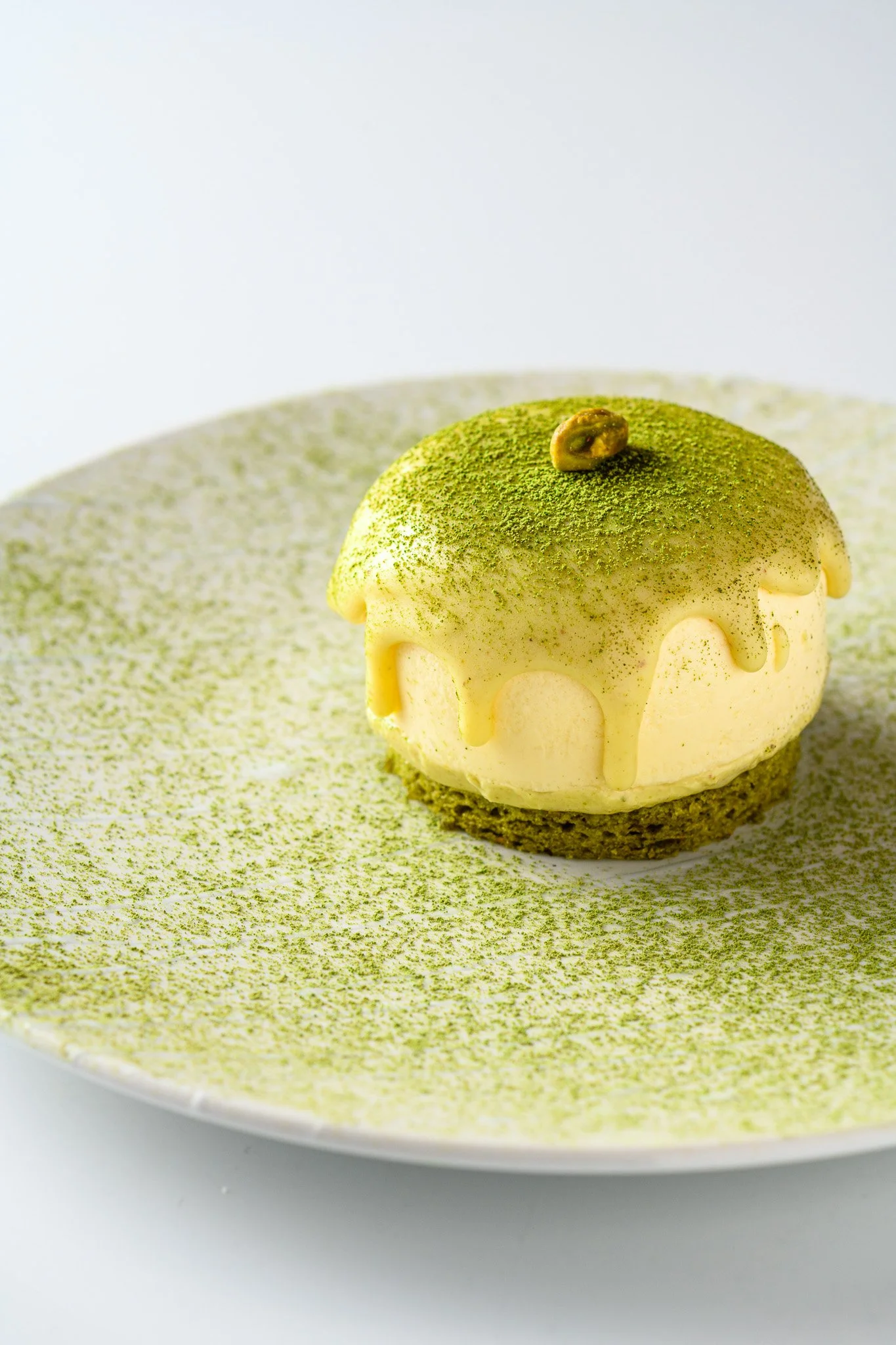 生地はクリームやムースに良く馴染むよう、小麦を入れない口溶けのいい米粉生地に、その上にはピスタチオガナッシュの層を。マスカルポーネとサワークリームでムースを作り濃厚ふわふわに、芯部分には抹茶のブリュレを、表面はピスタチオのグラサージュでコーティング。
