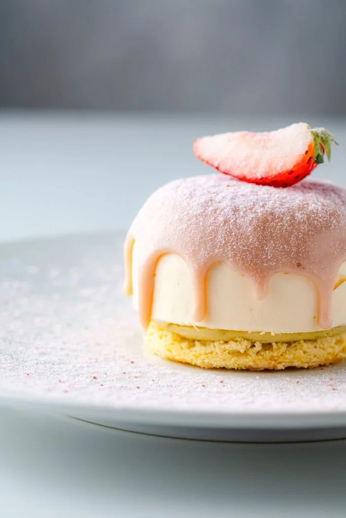 A delicate blend of rice flour sponge, pistachio ganache, mascarpone-sour cream mousse, and a matcha brûlée core — all coated in strawberry glaze.