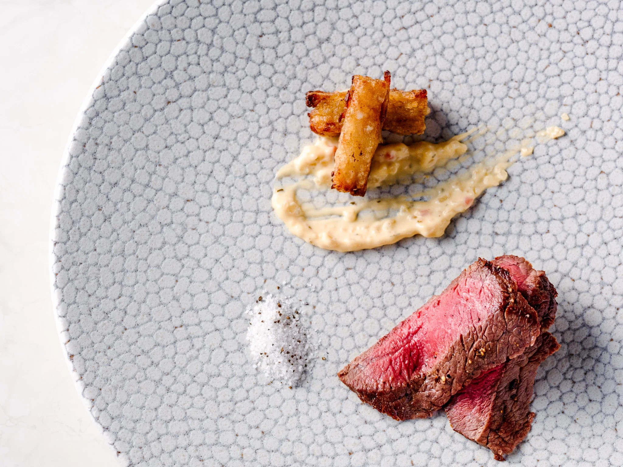 Recently, we've transitioned from sirloin to beef tongue, which is slow-cooked to a tender, rare finish. Given its sweetness and slight acidity from the red meat, we now pair it with a lighter, less oaky Pinot Noir.